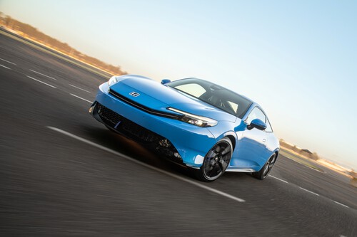 Por fuera no parece un ejercicio retro. Honda eligió una imagen limpia, baja y ancha, con un frente afilado y una silueta suave que sí se ve diferente dentro del portafolio de la marca. La parrilla en cromo negro, los detalles azules y los calipers en ese mismo tono refuerzan el carácter deportivo. También ayuda la aerodinámica, con trabajo especial en la parte baja delantera y en el borde del portón trasero para ganar estabilidad a velocidad alta.