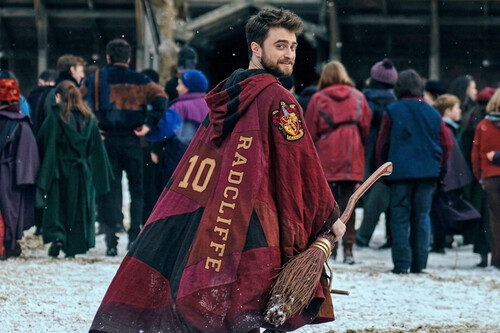 Crea una escena cinematográfica inspirada en un estadio de quidditch de una escuela mágica, similar a la estética de Harry Potter (imagen 1). Reemplaza al personaje original con la persona de la foto de referencia (imagen 2), manteniendo sus rasgos faciales, tono de piel y peinado exactamente iguales. la persona se aleja de la cámara en un patio lleno de estudiantes, pero gira ligeramente la cabeza hacia atrás por encima del hombro en una pose natural y segura. Lleva una capa de quidditch de la casa Gryffindor con detalles en color rojo y negro, no olvides incluir el escudo de la casa de Gryffindor y una escoba nimbus 2000. La tela debe estar ondeante, textura realista, ligeramente desgastada. En la parte posterior de la capa, escribe el nombre "Radcliffe" e incluye el número 10 de jugador del equipo de quidditch en un estilo deportivo (como los uniformes profesionales). Entorno: entrada a un estadio mágico medieval, estructuras de madera, estandartes de las casas Gryffindor y Slytherin, atmósfera invernal fría, nevada suave, profundidad de campo cinematográfica. Iluminación: luz natural suave, ligeramente dramática, con gran detalle y sombras realistas. Estilo: ultrarrealista, fotografía cinematográfica, 4K, poca profundidad de campo, fotograma de película, composición dramática. Importante: no cambies los rasgos faciales de la persona en cuestión.