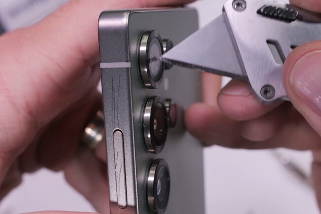 También en la parte posterior, los lentes de las cámaras del Galaxy S25 Ultra también resistieron las rayaduras del cortador, pero no fue igual con los anillos alrededor. Jerry fue capaz de levantar los anillos usando su herramienta, aunque sí tuvo que usar mucha fuerza. De hecho, el anillo superior no cedió, ya que al intentar levantarlo incluso comenzó a levantarse el cristal posterior. El hecho de que los anillos no sean parte del cristal posterior sino componentes externos ha levantado una polémica en la que se acusa a Samsung de "engañar" a los usuarios.