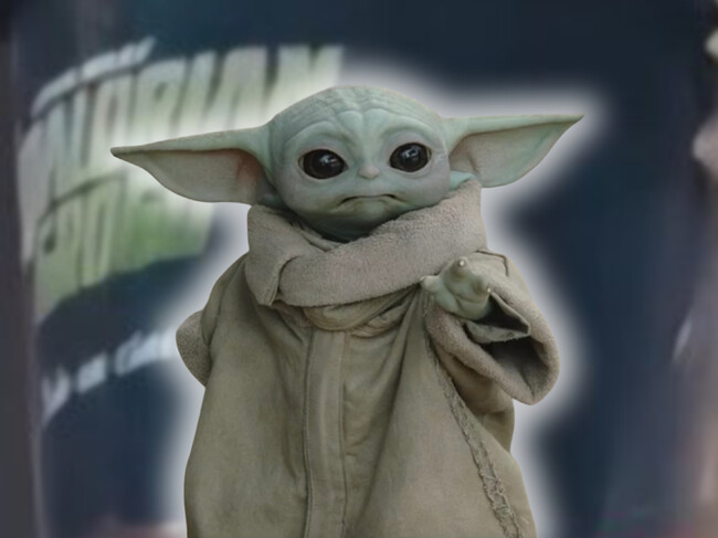 - Grogu aparece en formato figura 3D sujetando la cubeta.