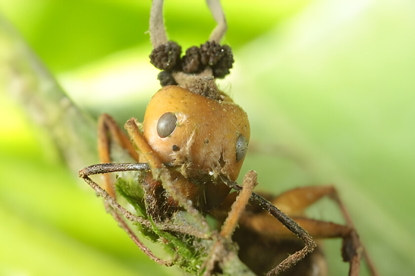 La víctima entonces es obligada a abandonar su colonia y trasladarse a otro sitio con las condiciones ideales para el hongo, Ballesteros explicó que estos lugares fungen como "cementerios" donde las hormigas usan sus mandíbulas para adherirse al sustrato. Los hongos crecen en los cadáveres de los artrópodos, los cuales les brindan protección y nutrientes para garantizar la reproducción exitosa de sus esporas.