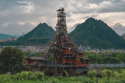 En la provincia de Guizhou, China, un hombre de 43 años ha pasado los últimos siete años desafiado al gobierno, que decidió demoler su pueblo natal para construir un complejo vacacional. Para ello ha erigido un imponente "castillo" de 11 pisos de habitaciones de madera rojiza encajadas unas sobre otras, sostenida por poleas, cubos de agua y columnas recicladas.