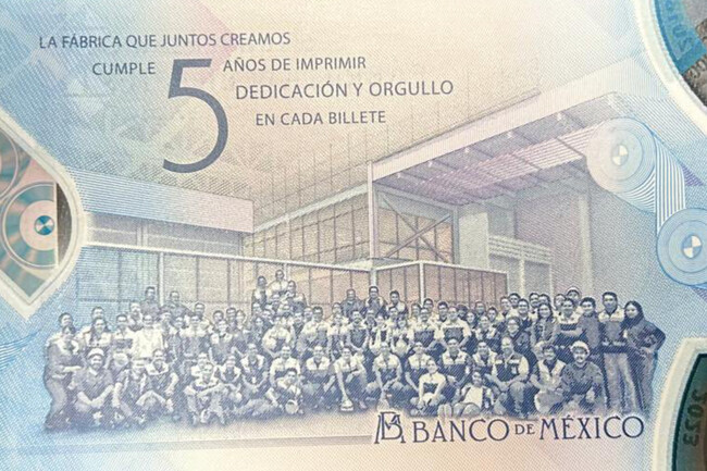 En el anverso se muestra la fachada de la Fábrica de Billetes en El Salto y en el reverso aparece personal de la planta. Todo esto contribuye a que, si alguien lo ve fuera de contexto, crea que es un nuevo billete oficial.