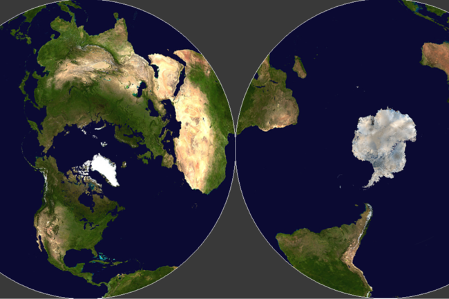 Astrofísicos de la Universidad de Princeton rediseñaron el mapa de la Tierra. Esta versión reduce al mínimo las distorsiones al pasar la superficie esférica a un plano. El formato resultante tiene la apariencia de un disco de vinilo, donde cada cara corresponde a uno de los hemisferios terrestres (norte y sur).