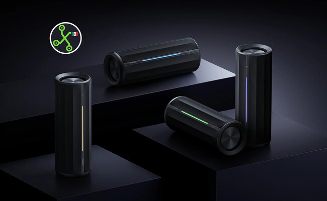 Asimismo, su batería ofrece autonomía de hasta 17 horas por carga, a lo que se suma su resistencia al agua y al polvo, junto con luces RGB que aportan ambiente en las reuniones. También ofrece la posibilidad de conectar varios dispositivos para compartir la música, e incluso puede integrarse con otras bocinas para ampliar el sonido.