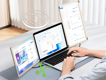 En cuanto a especificaciones técnicas, se trata de dos pantallas IPS con resolución Full HD que pueden colocarse en posición vertical u horizontal. Esto es posible gracias al soporte integrado, el cual permite montarlas sobre una superficie plana sin que el peso recaiga directamente sobre la pantalla de la laptop, evitando posibles daños si esta es demasiado ligera.